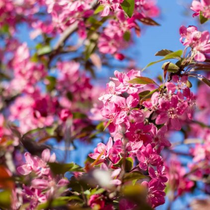 Malus ‘Mokum’ – okrasná jabloň s purpurově růžovými květy, barevným olistěním a drobnými červenými plody, které zdobí strom až do zimy.