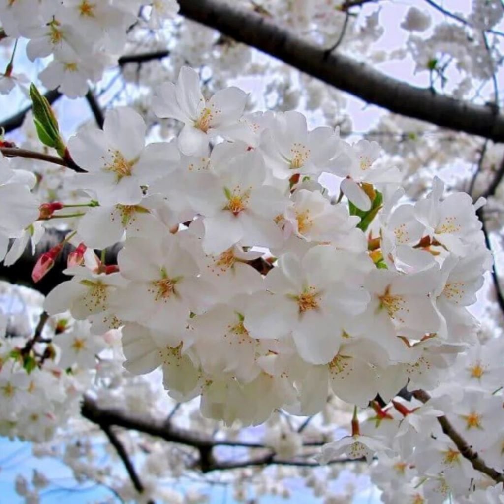 Prunus serrulata ‘Tai-haku’, známá jako Velká bílá třešeň, je jednou z nejkrásnějších okrasných sakur. Tento středně velký opadavý strom dorůstá výšky 5–7 m a vytváří široce rozložitou korunu, která na jaře doslova září tisíci velkými bílými květy. Poupata jsou zpočátku jemně růžová a při rozkvětu se otevřou do čistě bílých květů o průměru až 6 cm – největších mezi okrasnými třešněmi. Mladé listy mají atraktivní bronzový nádech, později se mění na svěže zelené a na podzim hrají odstíny žluté a oranžové. ‘Tai-haku’ vyniká nejen nádherným jarním květenstvím, ale i dekorativním olistěním po celý rok. Vyžaduje slunné stanoviště a dobře propustnou půdu. Je vhodná jako solitér do zahrad, parků či reprezentativních výsadeb, kde se stane nepřehlédnutelnou dominantou.