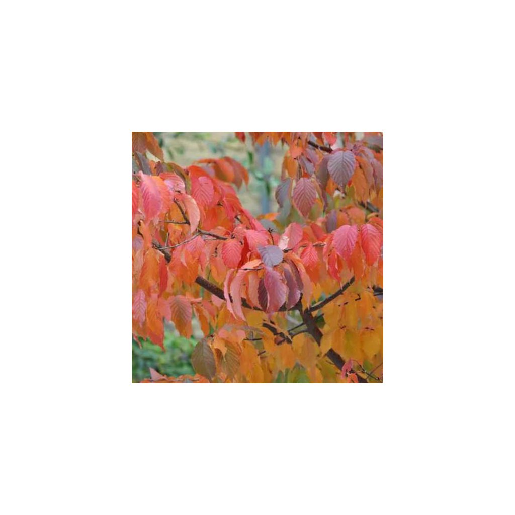 Listy se na podzim nádherně barví do oranžových a červených barev. Kvete bílými květy.